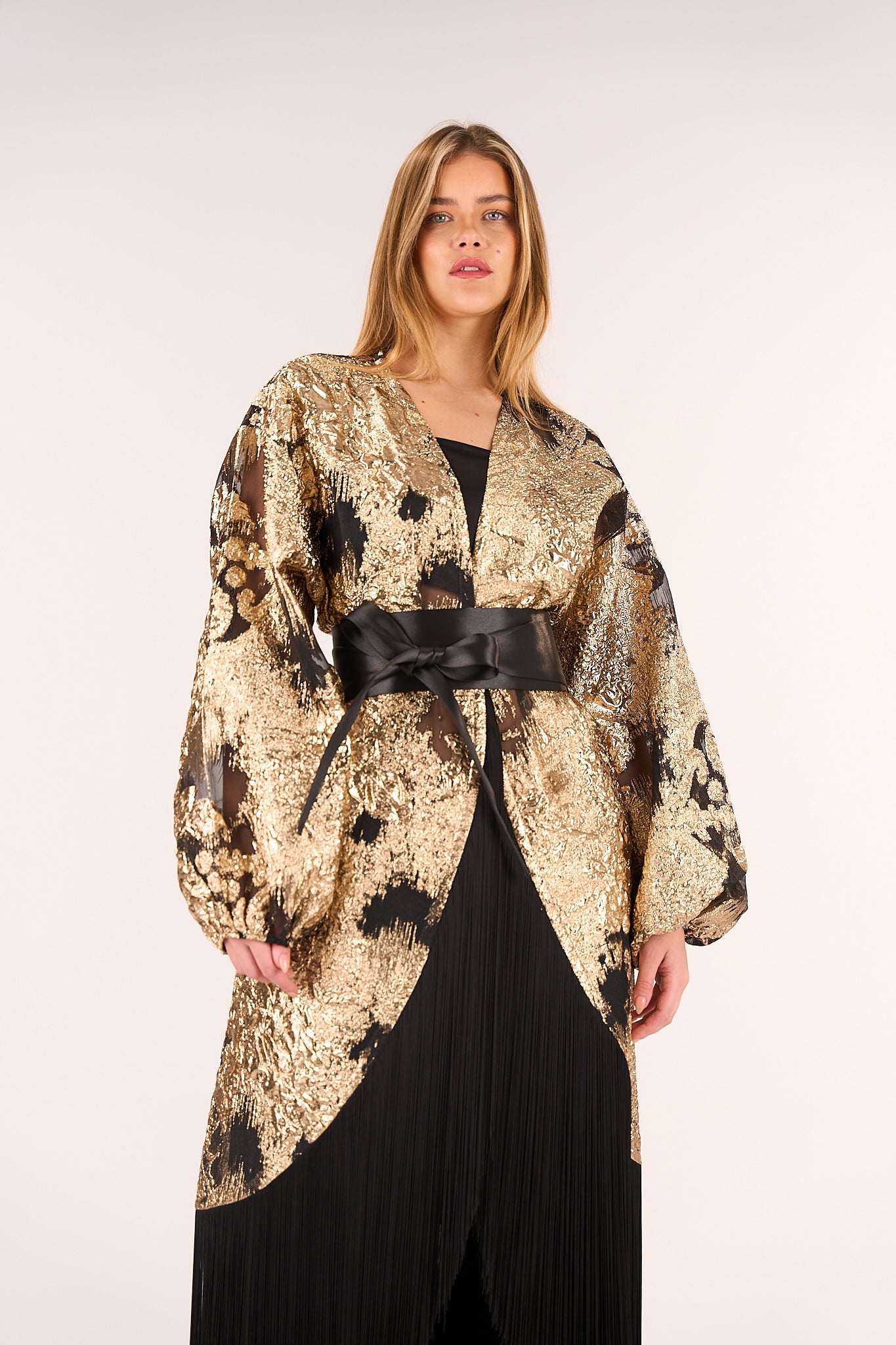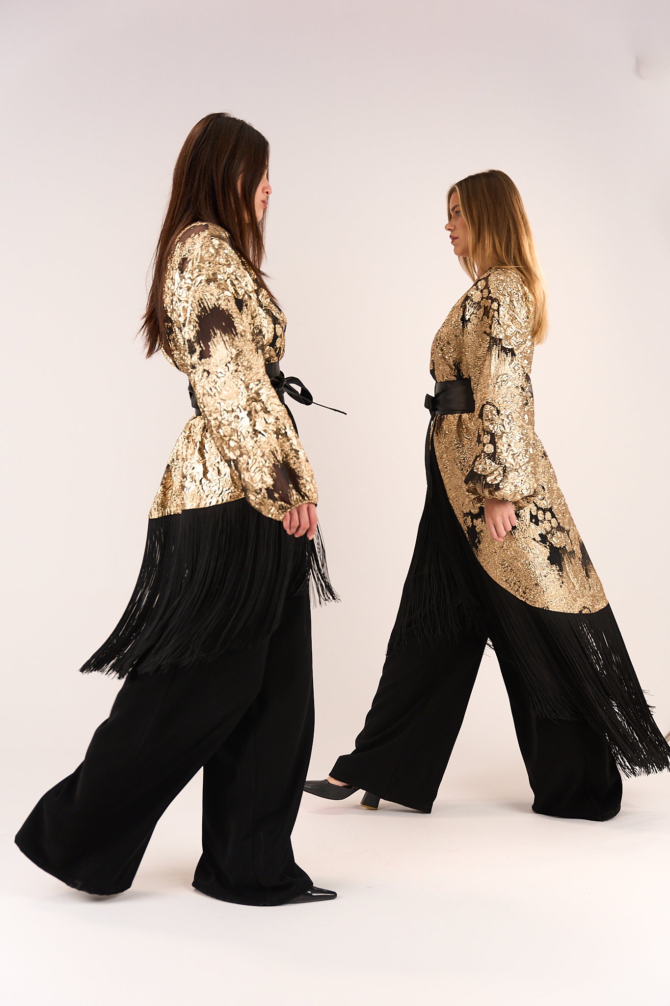 luminous golds, velvety blacks, and intricate fringes that shimmer and
