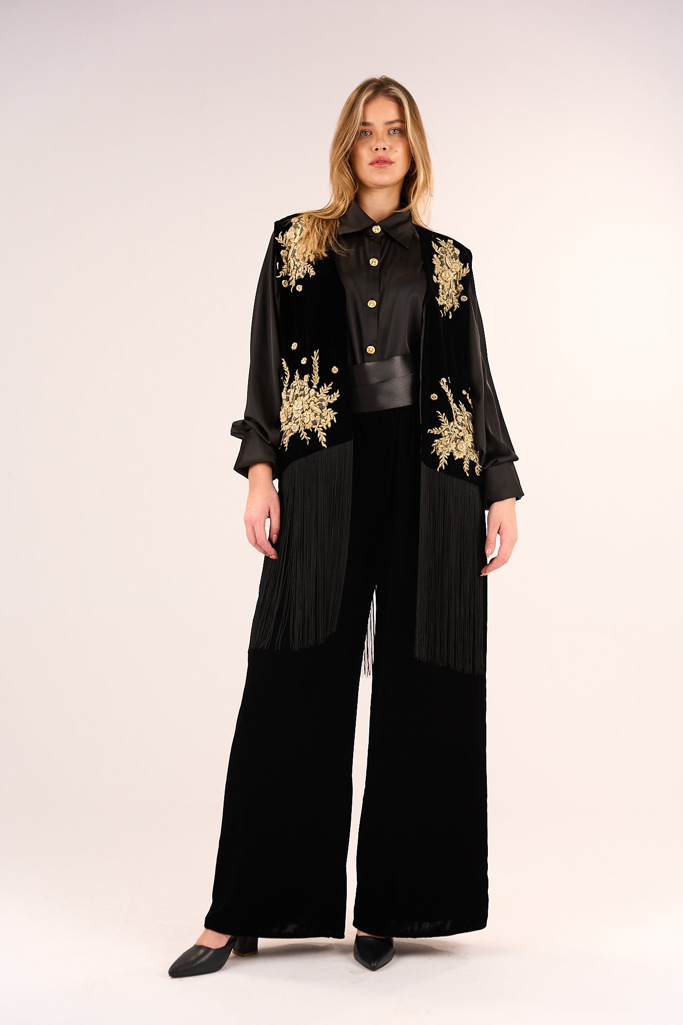 luminous golds, velvety blacks, and intricate fringes that shimmer and