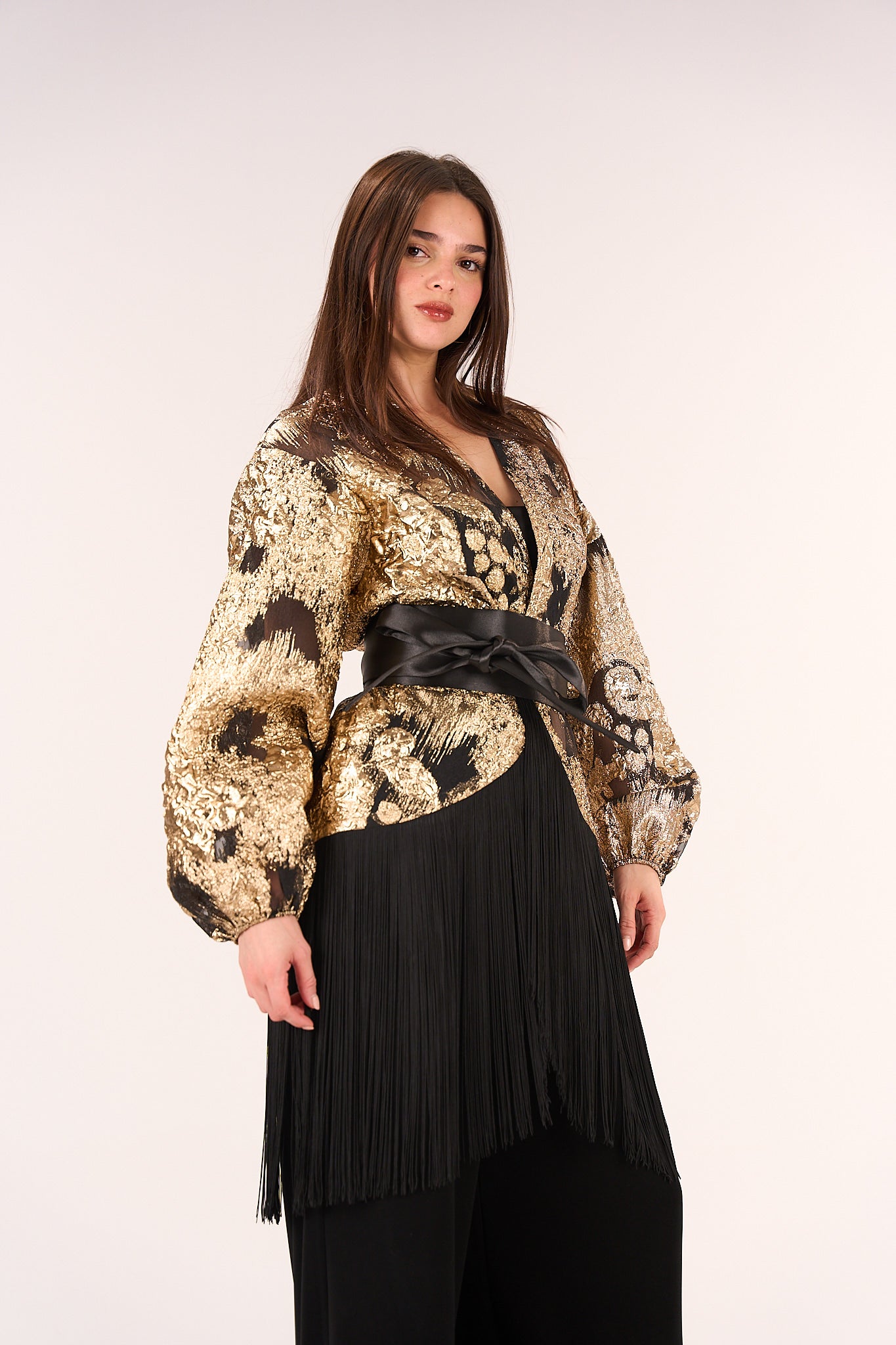 This short kimono reimagines classic brocade through modern proportions. Fringed detailing introduces softness and motion, creating a balanced silhouette that feels both contemporary and luxurious.