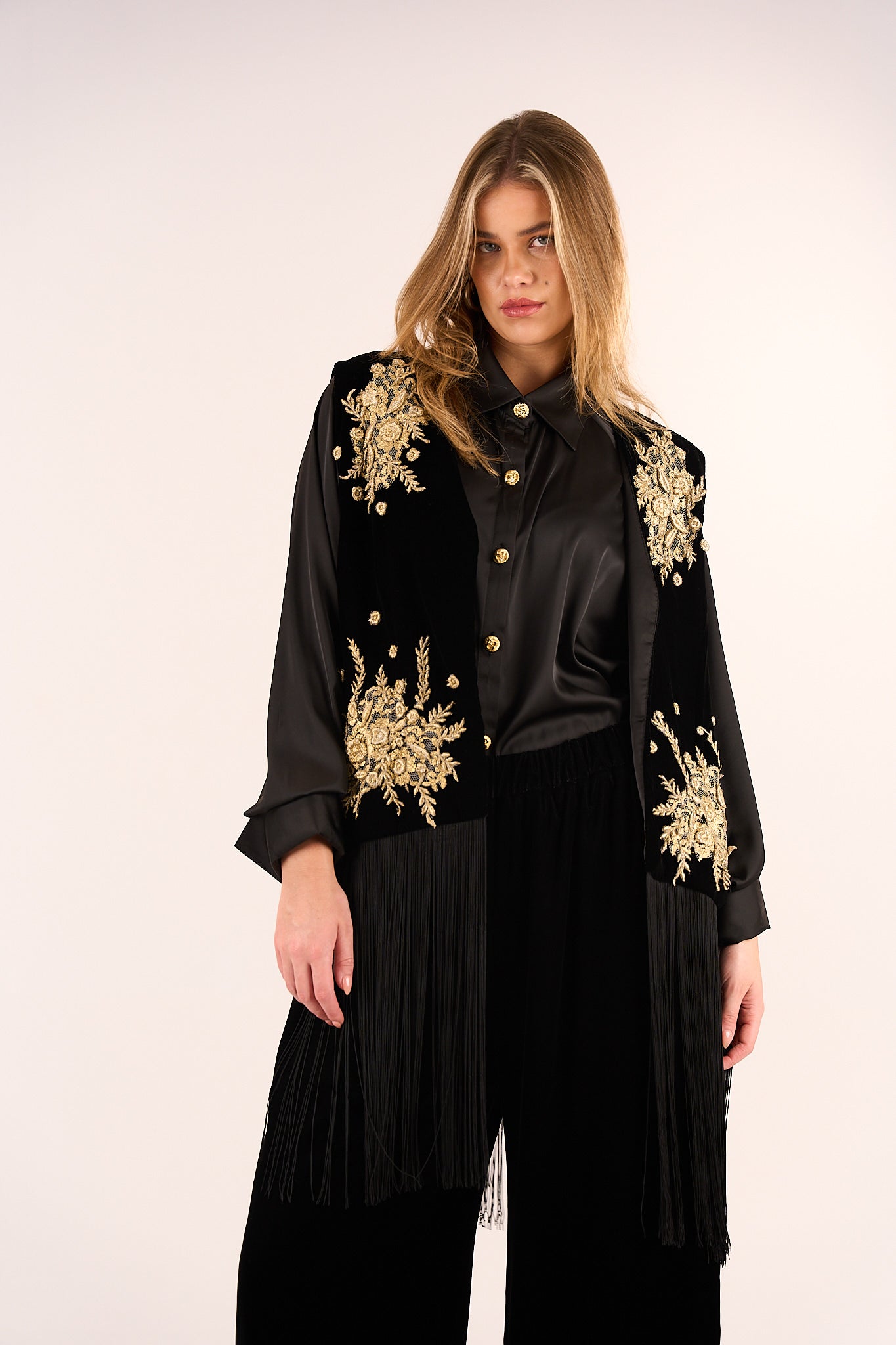 This vest and pants set is crafted from Silk Velvet encrusted with gold french lace, gold embroidery and long silk tasseles, delivering a rich texture and luxurious depth. The silhouette balances softness and strength, making it a refined statement for elevated occasions.